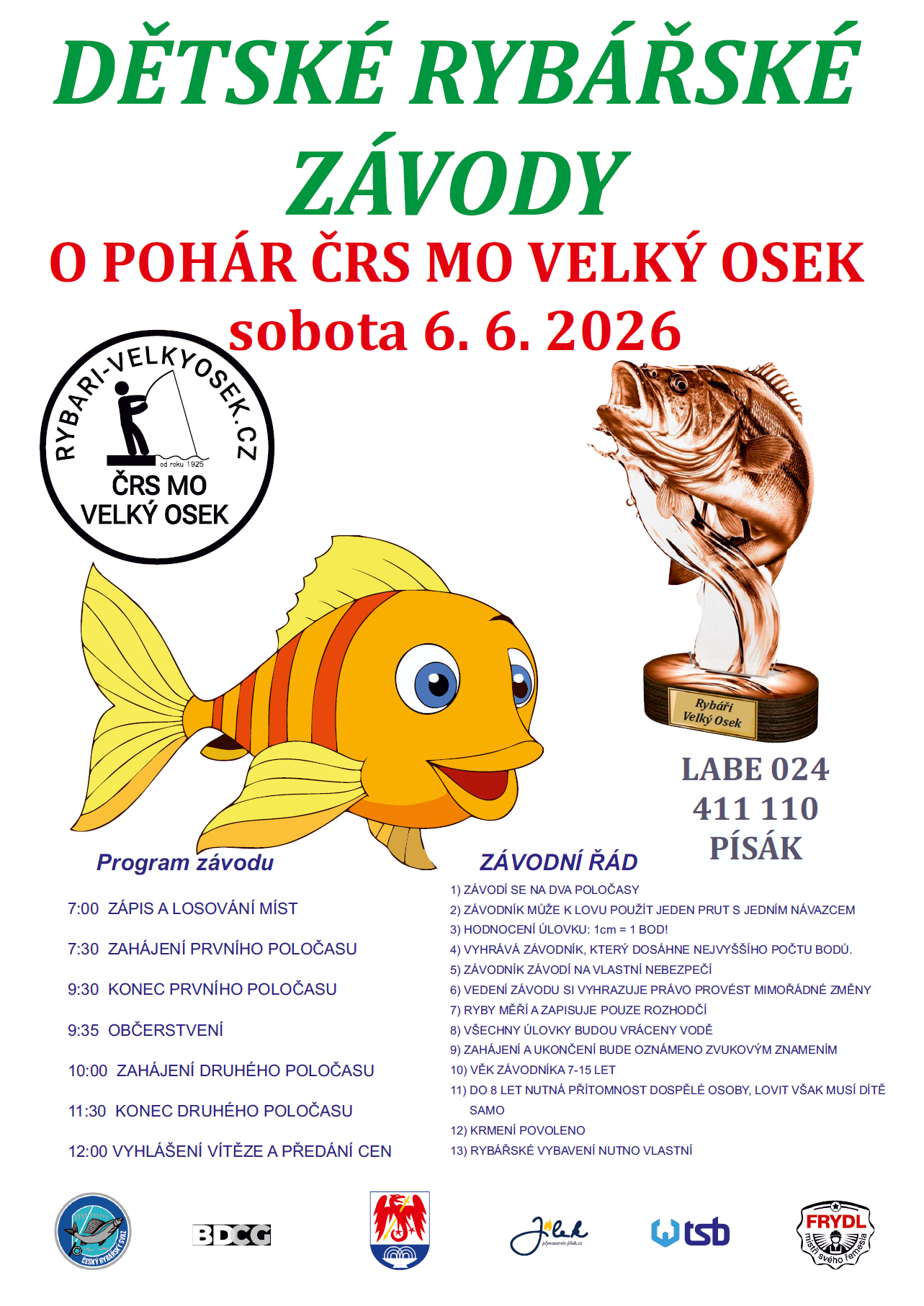 Zveme vás na dětské rybářské závody, které se budou konat 6. 6. 2026 na jezeře Písák.